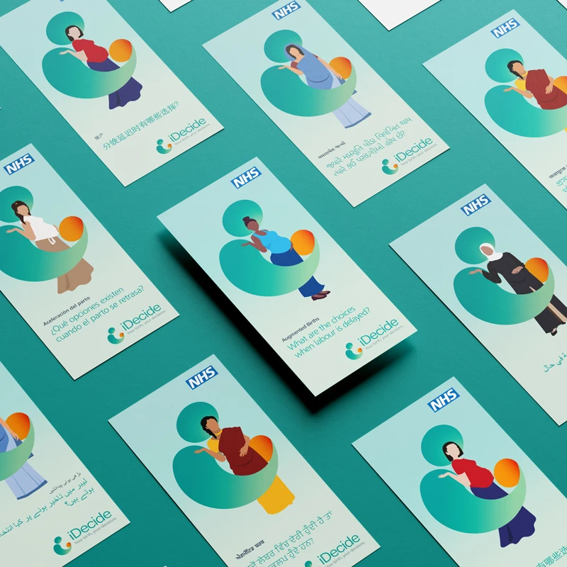 iDecide was developed by NHS England & Improvement. Its aim is to help staff improve communication through informed decision-making and consent during labour. We were asked to deliver a visual identity and communication materials for the toolkit. The visual approach of the materials would help people feel informed, cared for and empowered to make decisions about their care. In addition to the visual approach we also needed the designs to be diverse enough to embrace a range of cultural differences.